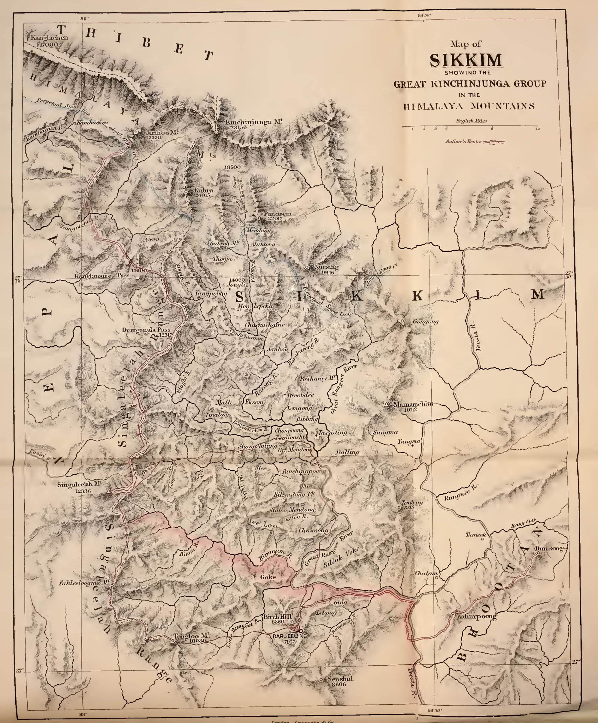 En ese mapa se puede ver como recorrieron prácticamente la frontera entre Nepal y Sikkim (provincia de la India) por la zona del Kangchenjunga. En su relato, Nina nombra distintos picos como el Junnoo (Jannu) o el Kubra (Kabru).